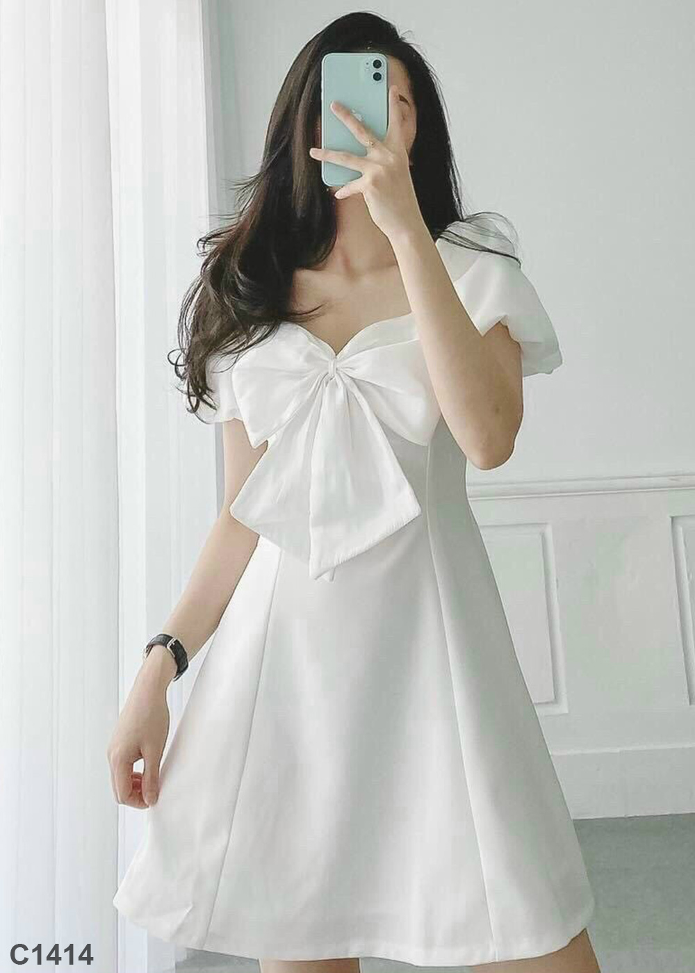Đầm voan thắt nơ xòe trắng C1414