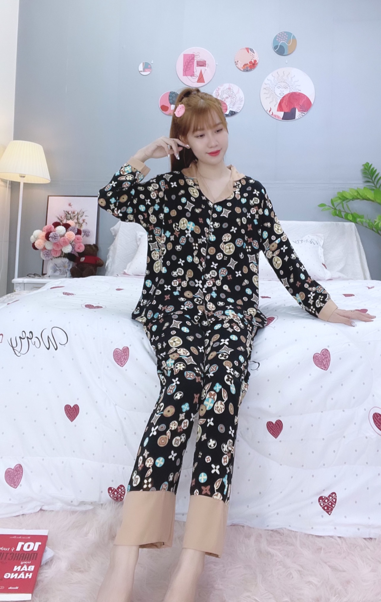 Đồ ngủ pijama dài phối cổ bèo đen D1648